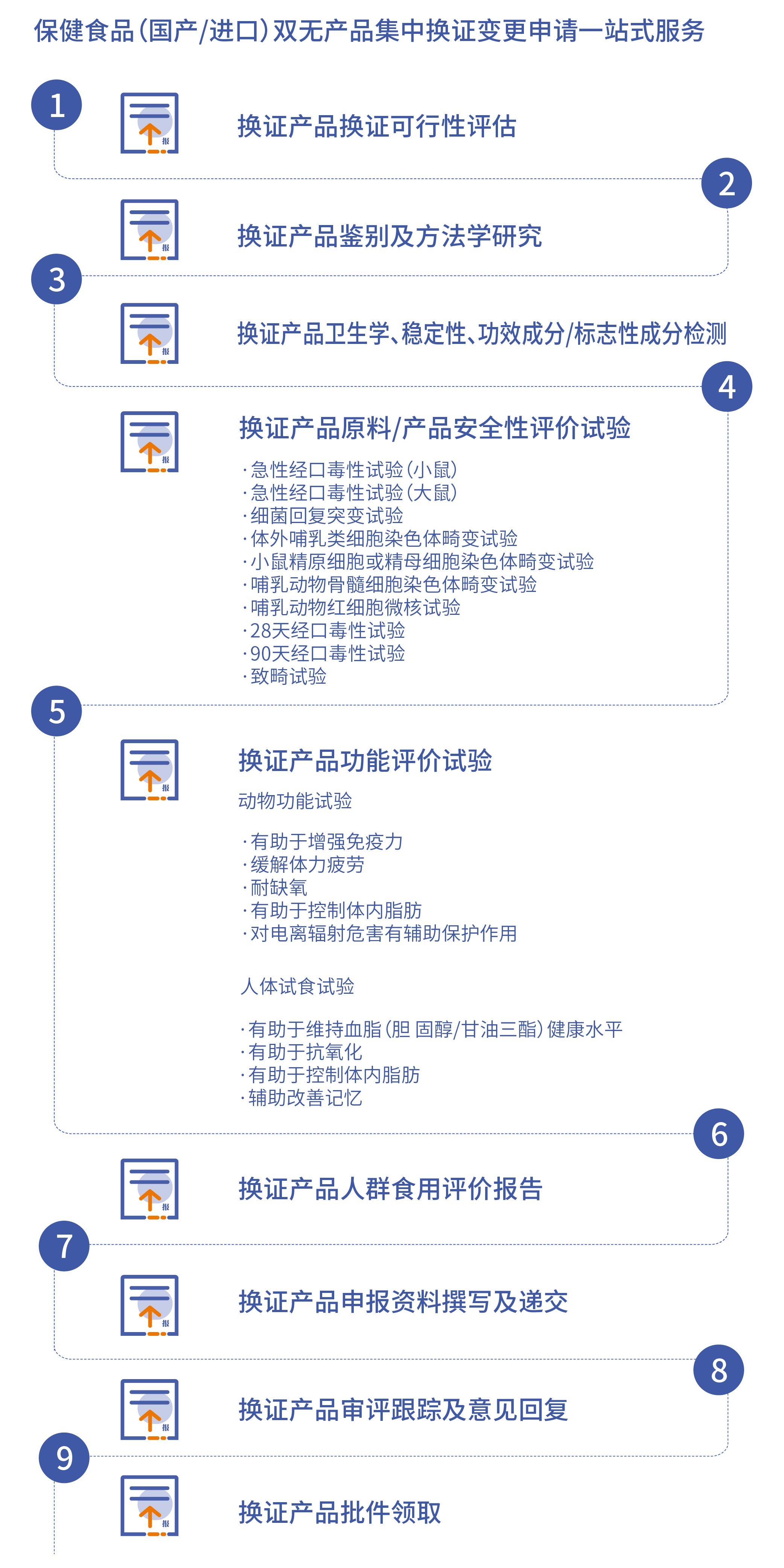 三批次:功效成分/營養成分、衛生學、穩定性試驗 方法學驗證試驗 安全性試驗 功能性試驗 人體試食試驗 |