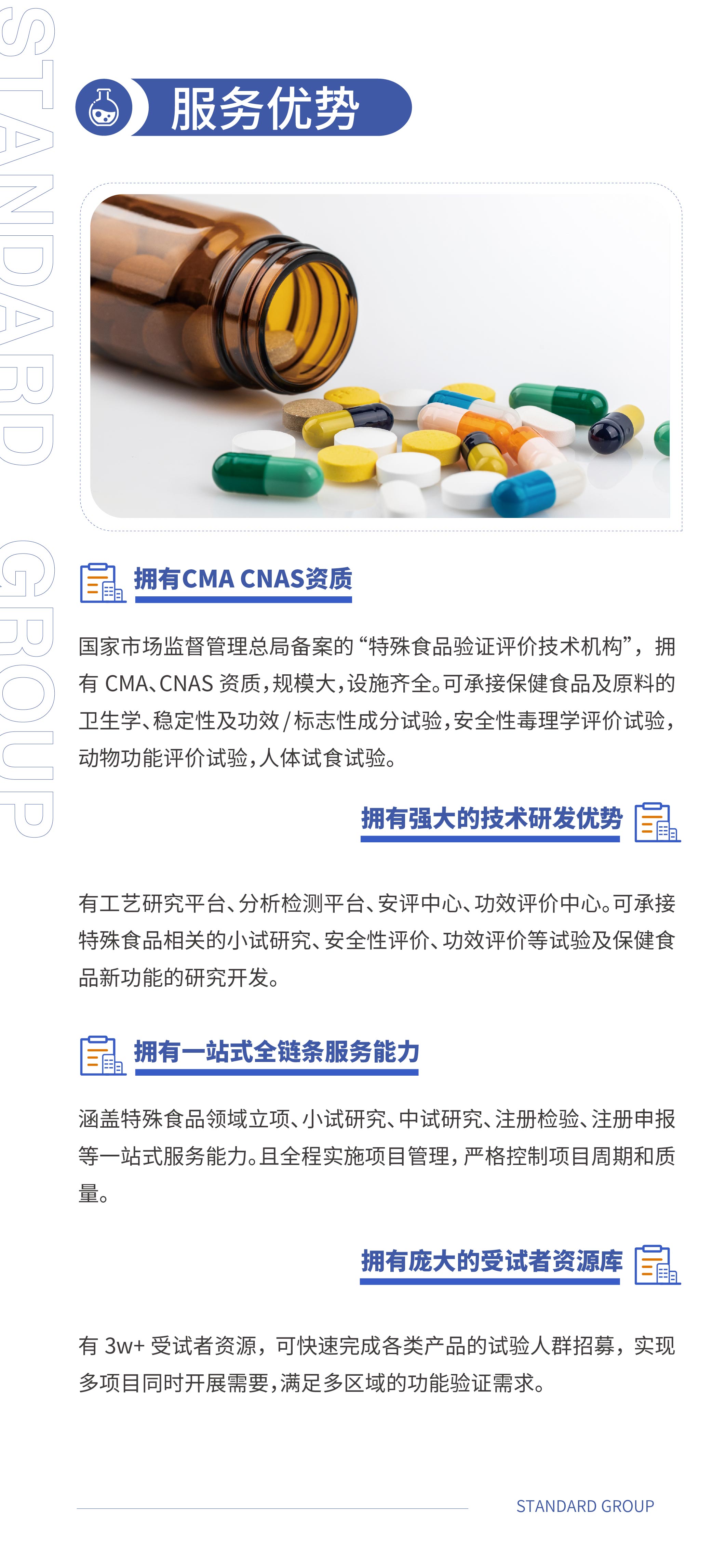 生命科學是斯坦德集團長期深耕的核心領域之一,服務范圍涵蓋特殊食品、化妝品、消毒產品、涉水產品以及科研服務等領域,資質能力包括CMA、CNAS、ISO 9001質量管理體系認證以及實驗動物使用許可證等,是國家市場監督管理總局備案的特殊食品驗證評價技術機構、國家藥品監督管理局備案通過的化妝品注冊和備案檢驗機構、中國標準化研究院水效標識管理中心許可的水效標識備案檢測實驗室、青島市行政審批服務局備案的病原微生物實驗室。可提供涵蓋安全評價測試、動物功能試驗、人體試食試驗、人體功效測試、產品注冊和備案檢驗及多組學技術測試、多糖結構解析、動物建模、分子生物學測試、基礎分析測試等生命科學領域的科研檢測及課題外包服務。斯坦德生命科學,助力加快健康美麗產品上市,為品質生活事業保駕護航。