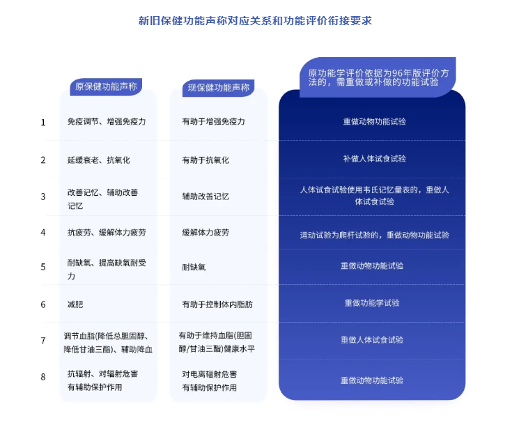 新舊保健功能聲稱對應關系和功能評價銜接要求