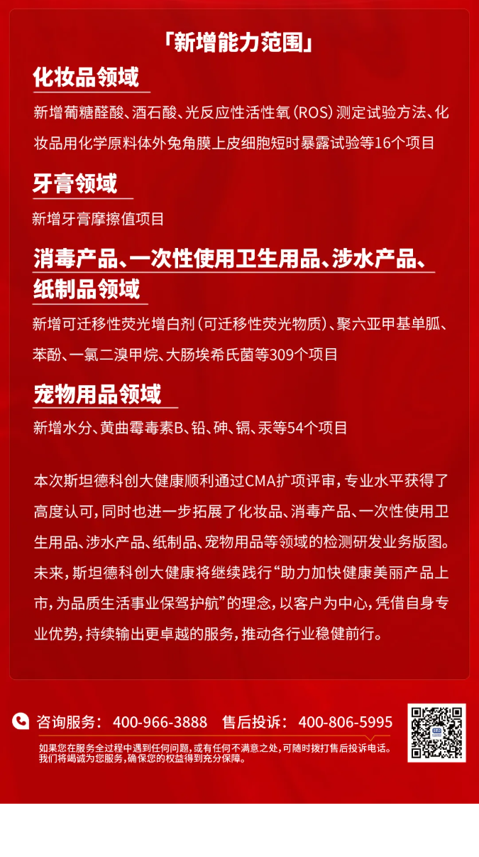 斯坦德大健康事業(yè)部隸屬于斯坦德集團(tuán),目前已具備CMA、CNAS、ISO 9001質(zhì)量管理體系認(rèn)證、實(shí)驗(yàn)動(dòng)物使用許可證等資質(zhì)能力,是國家市場監(jiān)督管理總局備案的特殊食品驗(yàn)證評價(jià)技術(shù)機(jī)構(gòu)、國家藥品監(jiān)督管理局備案通過的化妝品注冊和備案檢驗(yàn)機(jī)構(gòu)、中國標(biāo)準(zhǔn)化研究院水效標(biāo)識(shí)管理中心許可的水效標(biāo)識(shí)備案檢測實(shí)驗(yàn)室、青島市行政審批服務(wù)局備案的病原微生物實(shí)驗(yàn)室。可針對特殊食品、化妝品、消毒產(chǎn)品、涉水產(chǎn)品等領(lǐng)域,提供一站式全領(lǐng)域全鏈條的檢測及研發(fā)等技術(shù)服務(wù)。全國布局超20000平方米實(shí)驗(yàn)動(dòng)物設(shè)施及5000+平方米實(shí)驗(yàn)辦公場地,嚴(yán)格遵循ISO 17025、GLP等管理體系,確保數(shù)據(jù)精準(zhǔn)可靠。